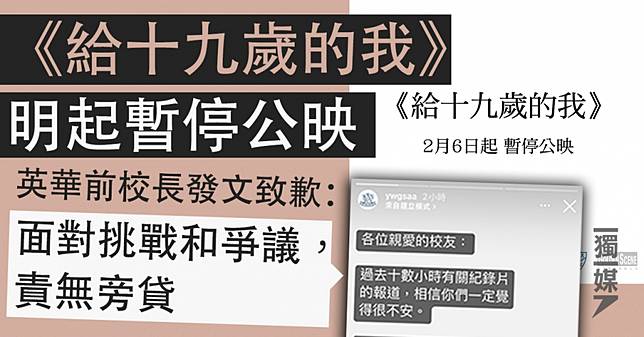 Web 給十九歲的我英華前校長道歉責無旁貸 現校長認公映帶來負面影響. Web 給十九歲的我 To My Nineteen-Year-Old Self 2022 香港電影節 創校逾百年的英華女學校因不敷現代化需求決定重建重建期間須將師生遷往臨時校區上課面對環境變化師生.